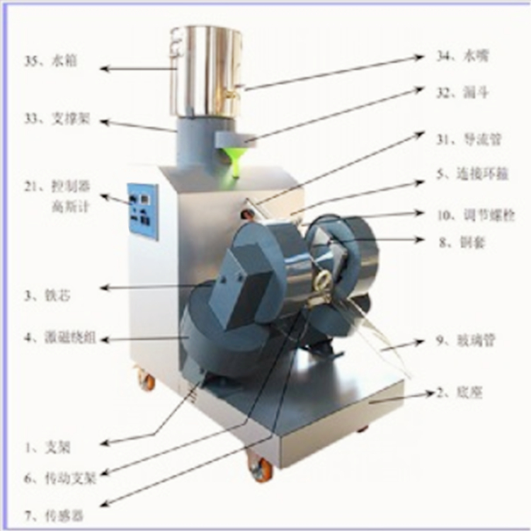 该机将磁场主体,试验管及管架,传动电机,储水箱及进出水部分,微机控制器及储物箱全部整合为一体。 一体化车式结构,为了保证测量的准确性,每一台磁选管均在出厂前做了磁场强度的标定,完全符合《选煤用磁铁矿粉实验方法》(GB/T18711-2002)对实验设备的要求。设备不用调试,出厂前已标定好